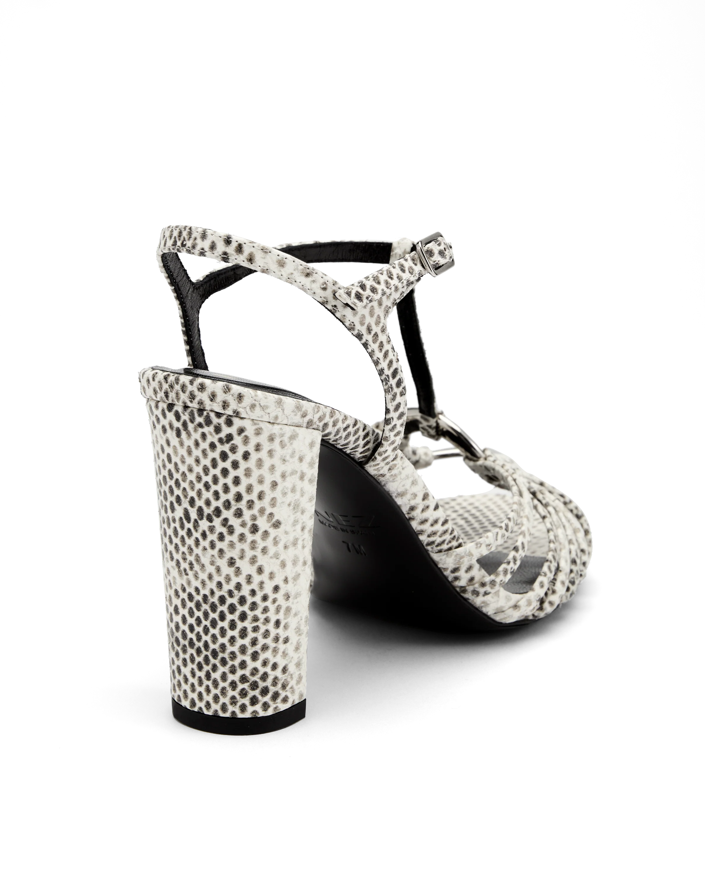 Limited Edition | Crafted in finely scaled snake emboss, a vertical t-bar strap traces down the foot, guiding the eye to a domed silver ring. Slender straps gently fan outward, forming a caged peep toe. Set on a block heel and embedded with our signature comfort insole.