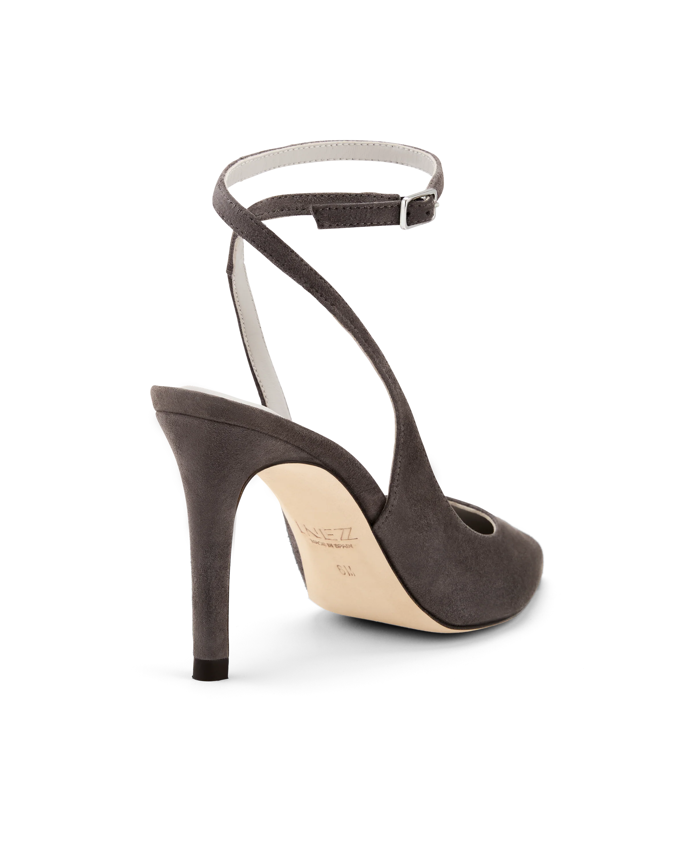 Portia is the definitive power pump with a refined stiletto heel, pointed toe, and slim adjustable ankle wrap. Crafted in soft suede—a timeless black or seasonal grey—and finished with our signature comfort footbed for lasting comfort.